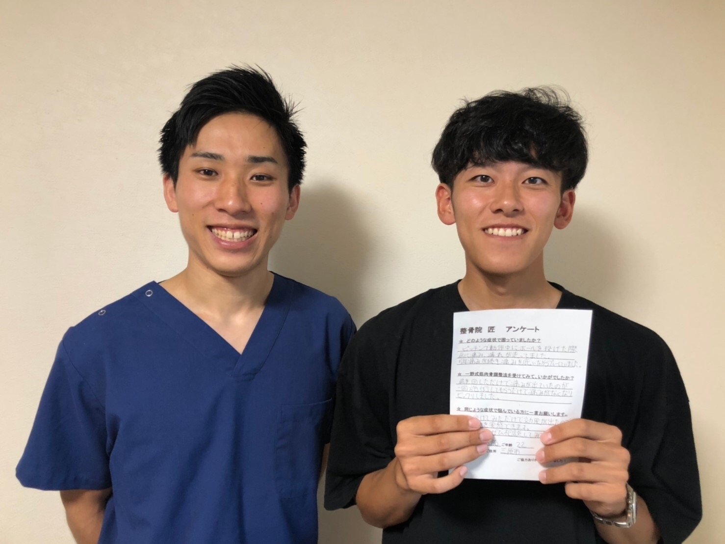 「運動を全力で出来るようになりました。」腰の痛みと脚の痛みや痺れで、歩くのが痛く、寝ていても寝がえりをすると痛みで目が覚め、仕事や日常生活に支障をきたしていました。 病院や他の接骨院に行ってもなかなかとれなかった痛みが週1、2回の施術を1ヶ月受けただけで痺れと痛みが全くなくなり、姿勢や歩き方にも変化を感じることができました。今では運動を全力で出来るようになりました。 今行っている施術でなかなかよくならない方や体の痛みに悩んでいる方には一野式筋肉骨調整を試してもらいたいです。 (谷原 周平さん) ※効果には個人差があります |