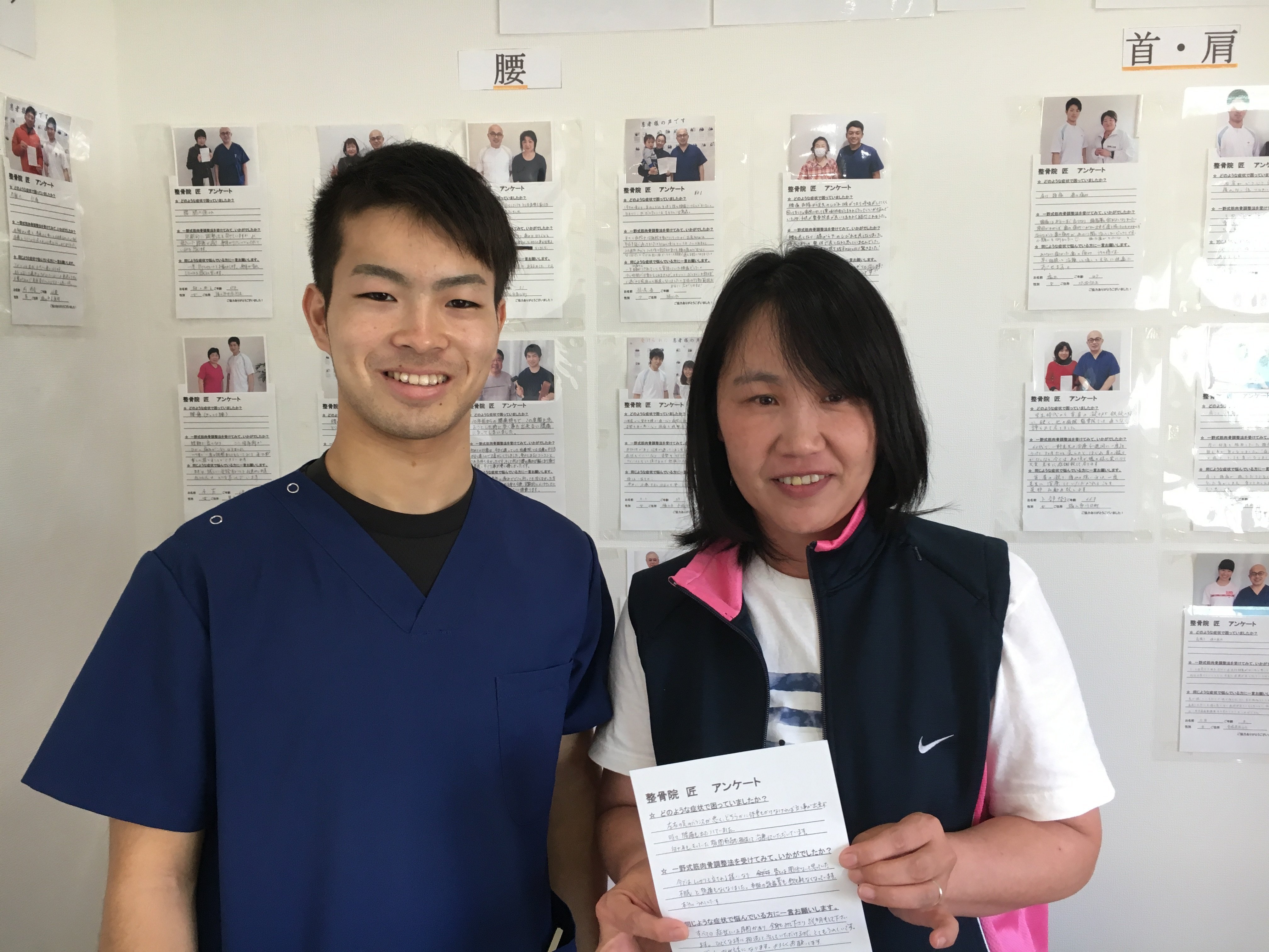 「体が楽になってきたのを実感できます!」以前から肩こり、腰痛、O脚、体のしんどさなどで悩んでいたのですが、昨年の4月に階段から落ちて腰を痛めてしまい他の接骨院に通っていましたが、なかなか良くならず辛い状態でした。 施術を受ける度に、腰の痛みが軽くなったり体が楽になってきたのを実感することが出来ます。 私と同じような症状で悩んでいらっしゃる方は諦めたりしないで1度相談してみることをおすすめします。 (池田 暁美さん) ※効果には個人差があります |